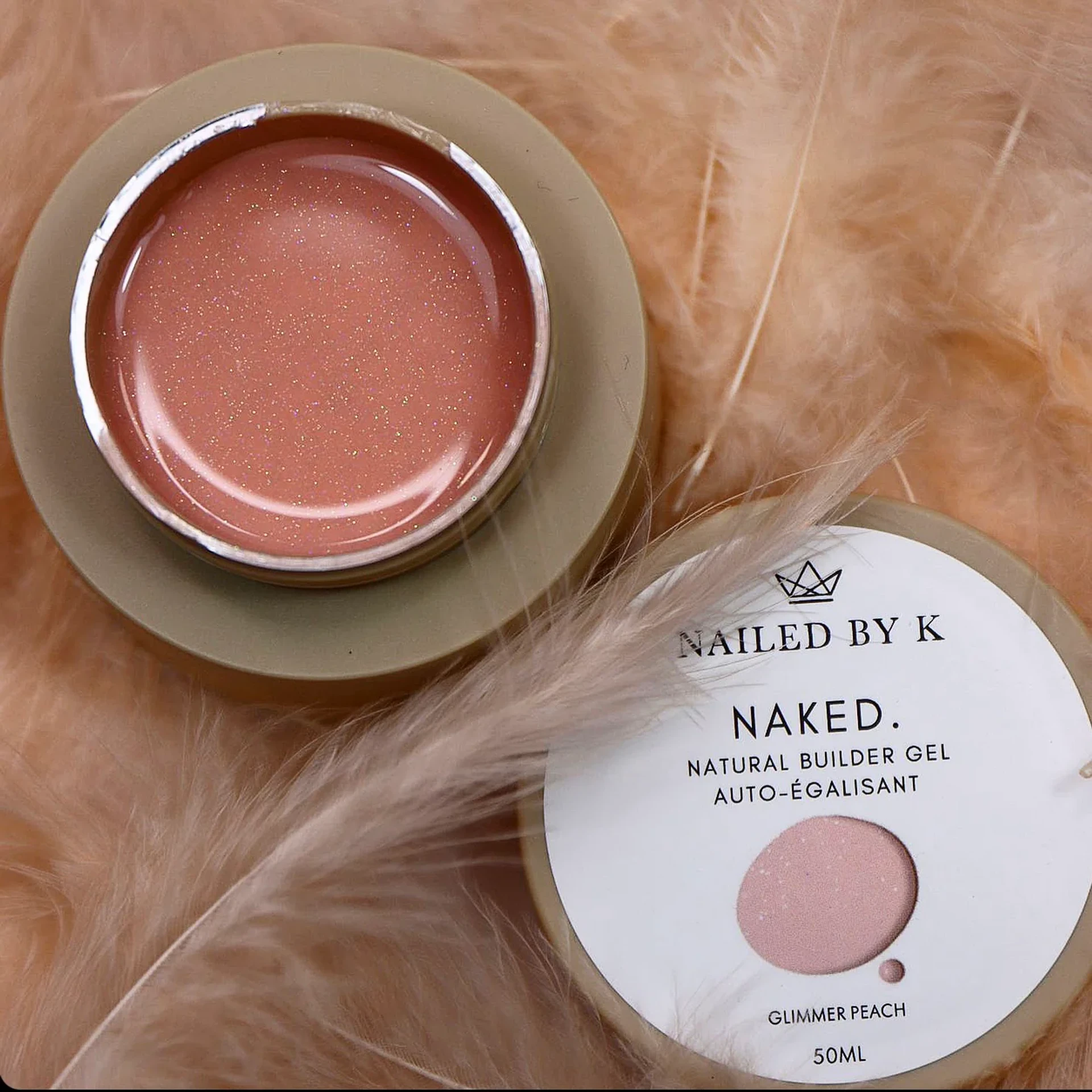Glimmer Peach de la collection Naked. de Nailed By K est un gel de construction auto-égalisant rose pêche nude aux micro-paillettes nacrées. Sa viscosité fluide facilite l'application et le limage, pour un rendu naturel et lumineux directement à la construction.