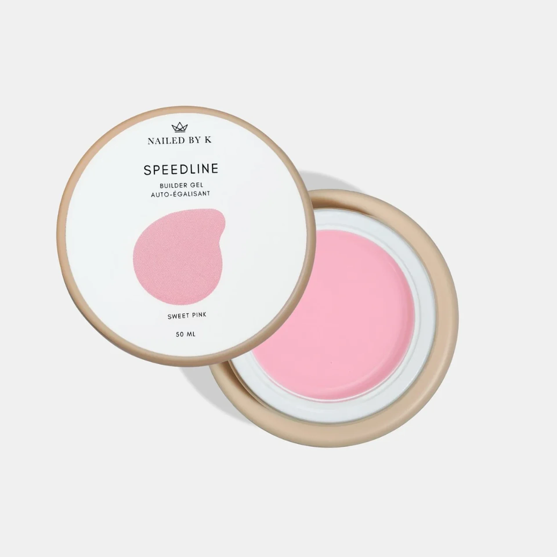 Le Gel de Construction Speedline Sweet Pink de Nailed By K est un gel auto-égalisant rose clair couvrant, à viscosité fluide, idéal pour les poses sans limage, en chablon, capsule et remplissage.