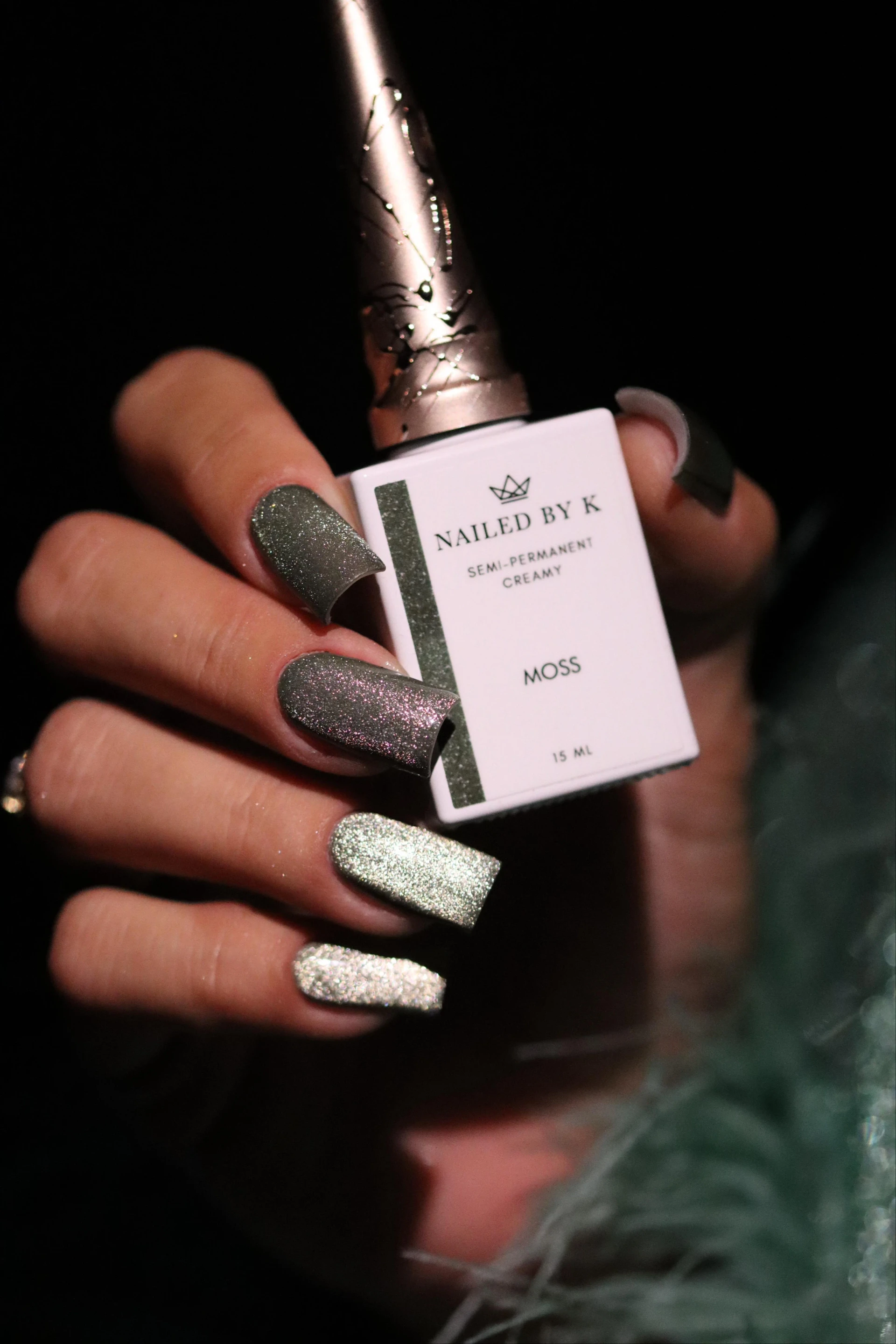 Moss de Nailed By K est un vernis semi-permanent Cat Eye 9D vert kaki foncé aux reflets argentés cuivrés. Son effet cat eye dévoile une bande lumineuse nacrée selon l'angle et la lumière, pour un rendu profond aux tons changeants.