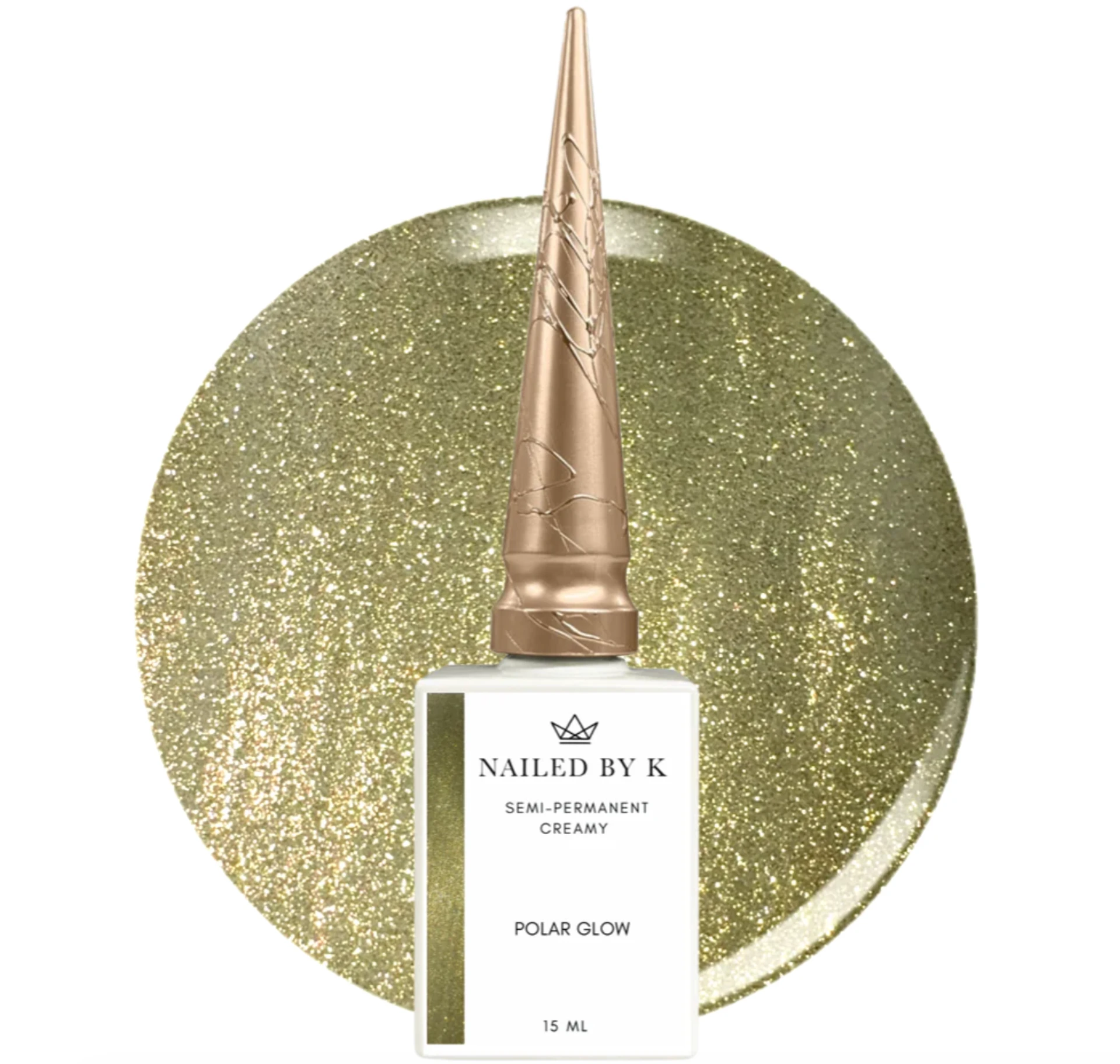 Polar Glow de Nailed By K est un vernis semi-permanent doré champagne chargé de micro-paillettes. Sa texture crémeuse et sa densité de reflets en font une couleur festive et lumineuse, parfaite pour les poses de fêtes comme pour une touche d'éclat au quotidien.