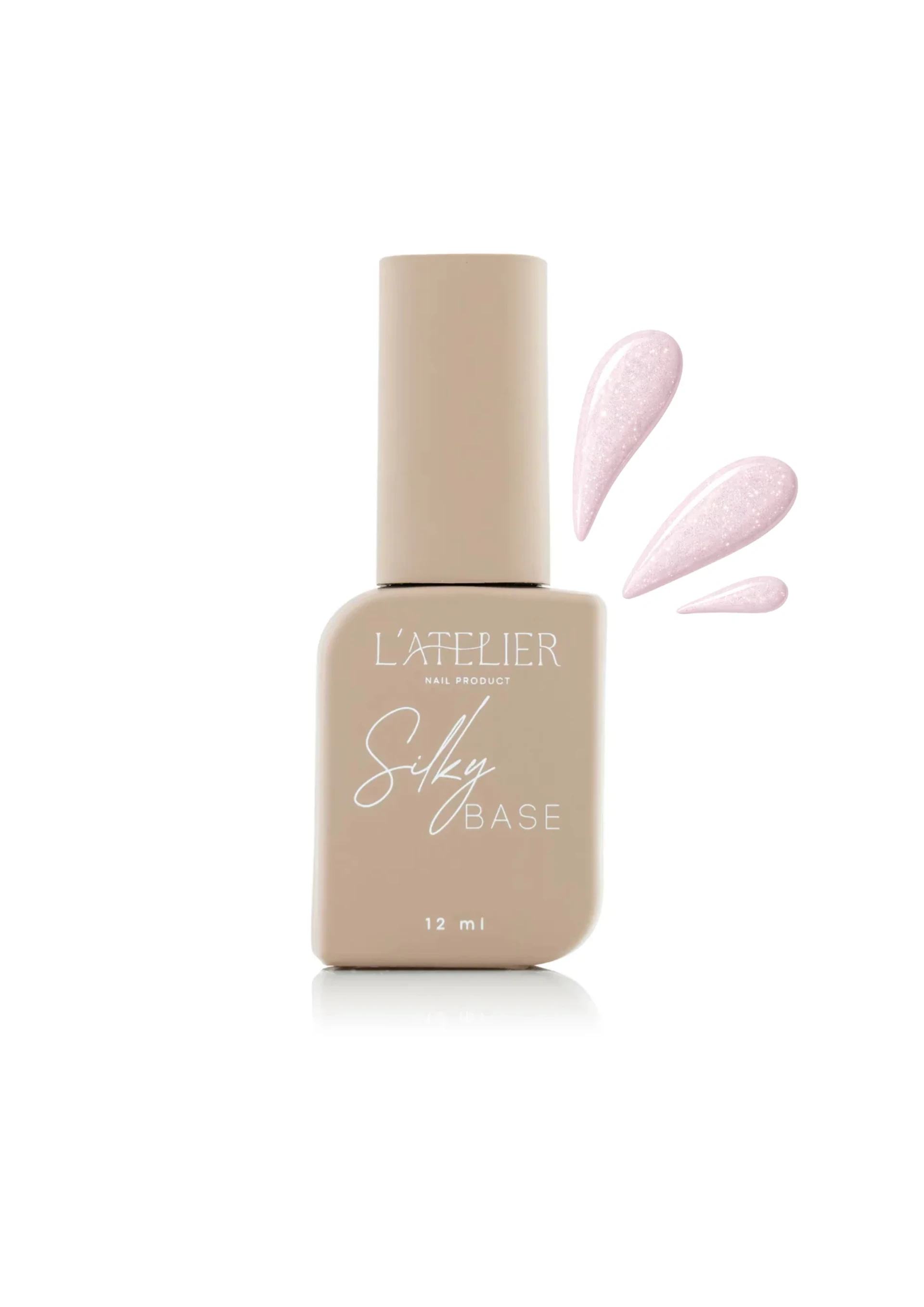 La Silky Base Soft Glow de L'atelier Nail Product est une rubber base cover rose poudré pâle aux micro-reflets shimmer, polyvalente et ultra-adhérente.