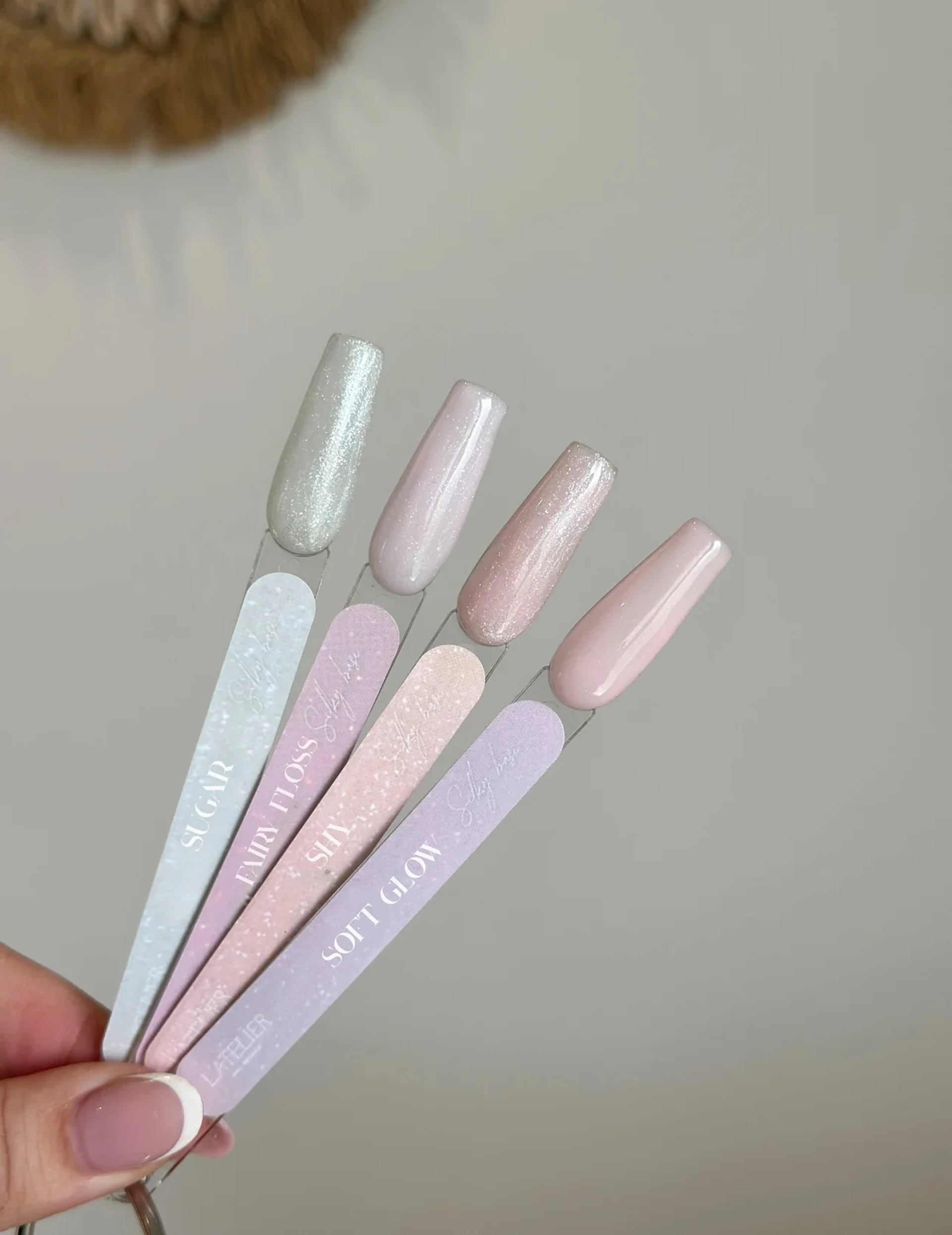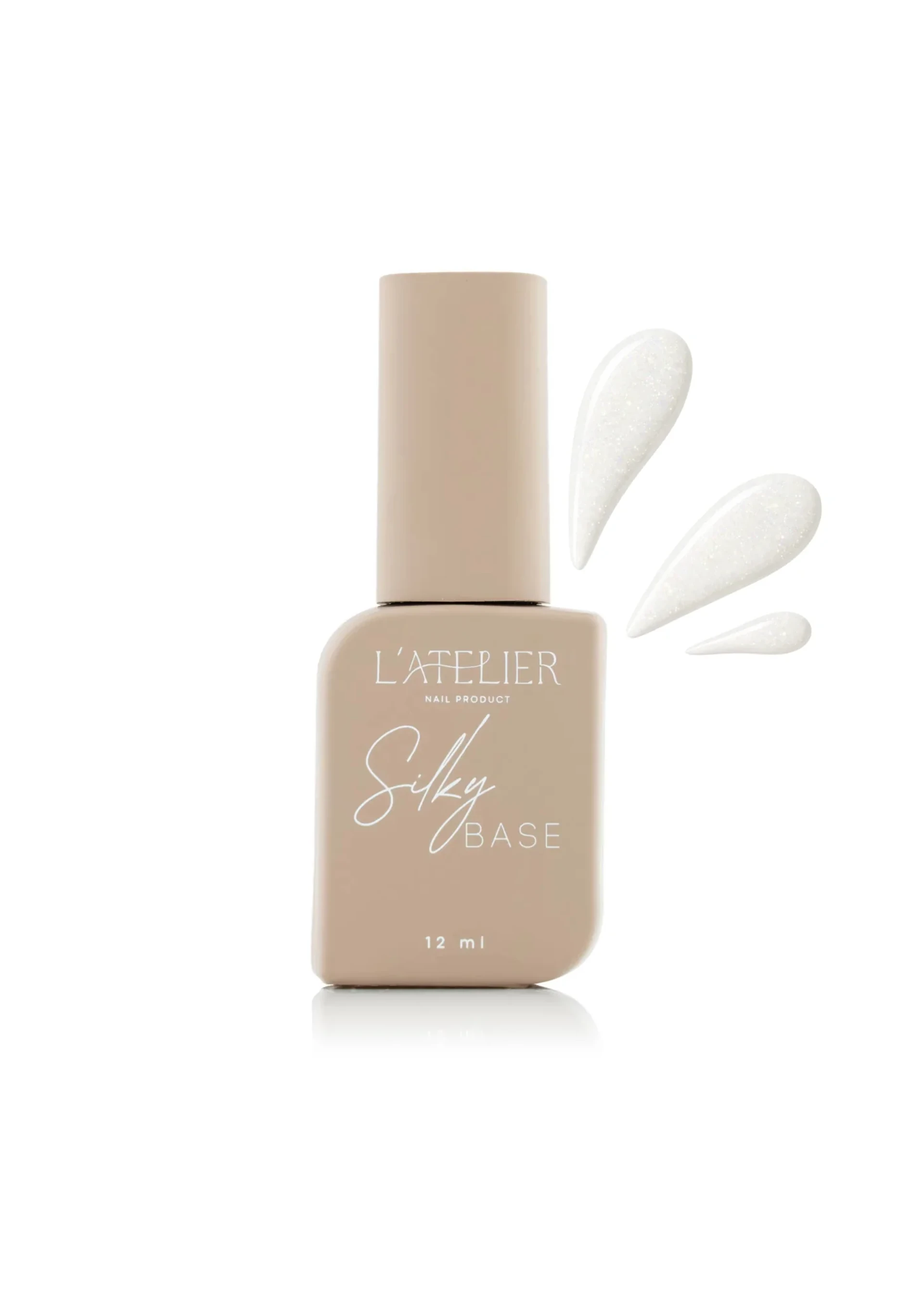 La Silky Base Sugar de L'atelier Nail Product est une rubber base cover blanche aux micro-reflets irisés argentés, polyvalente et ultra-adhérente.
