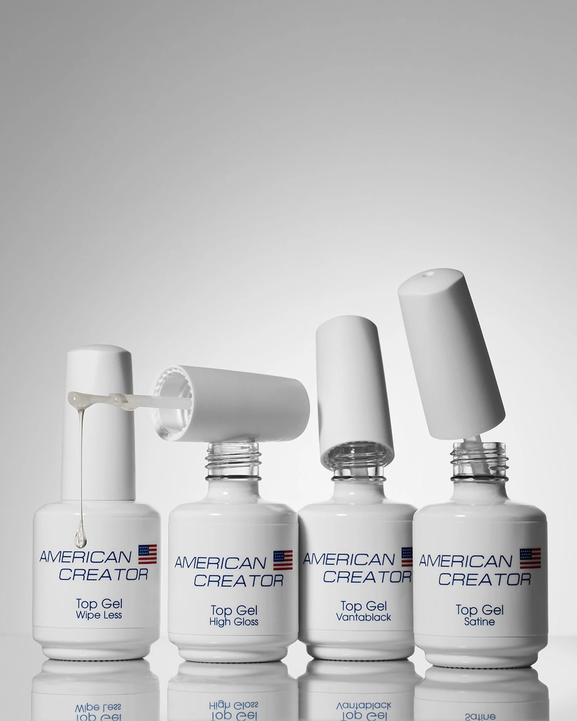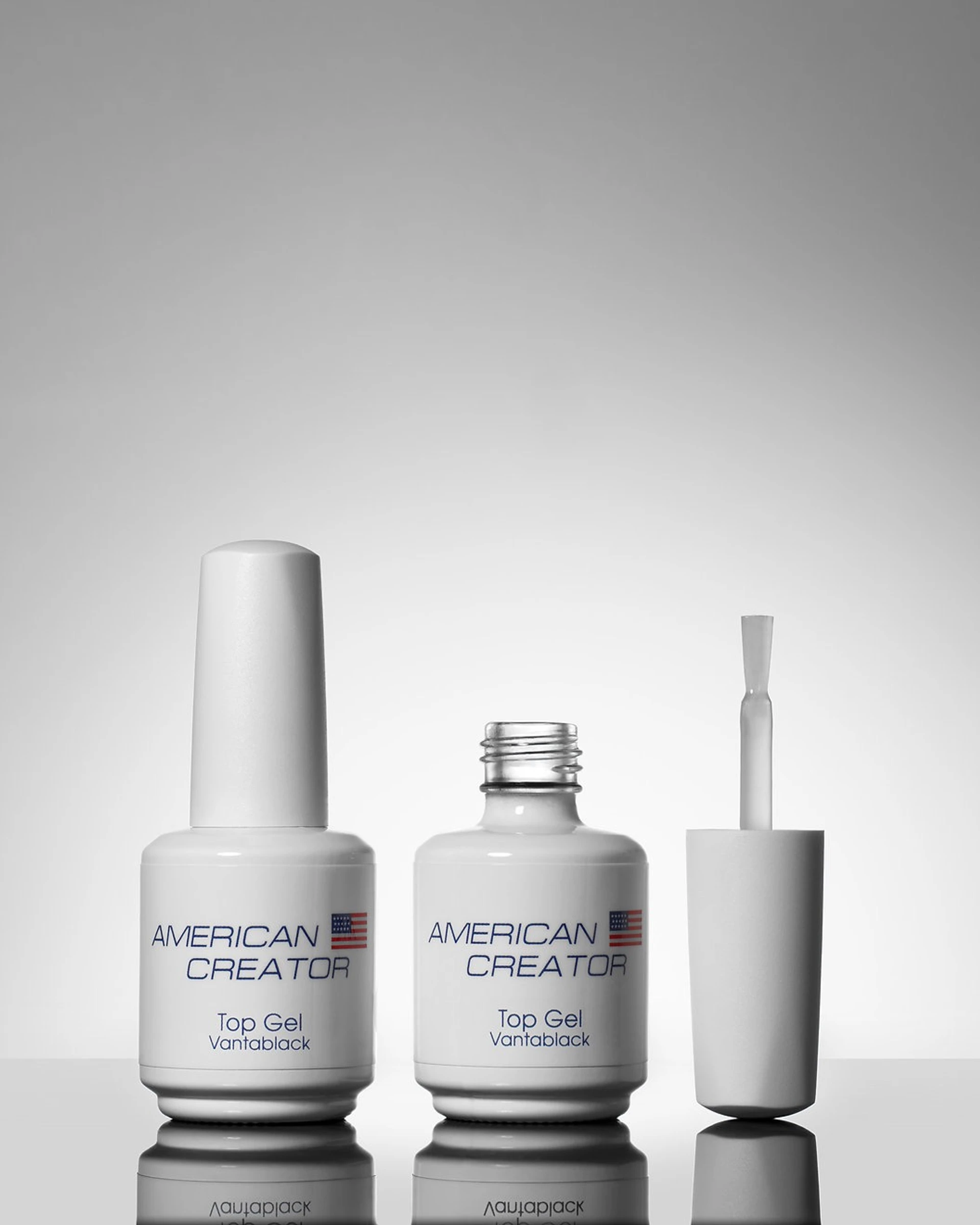 Le Top Gel Vantablack d'American Creator est un top coat avec inhibiteur UV, spécialement formulé pour les teintes foncées.