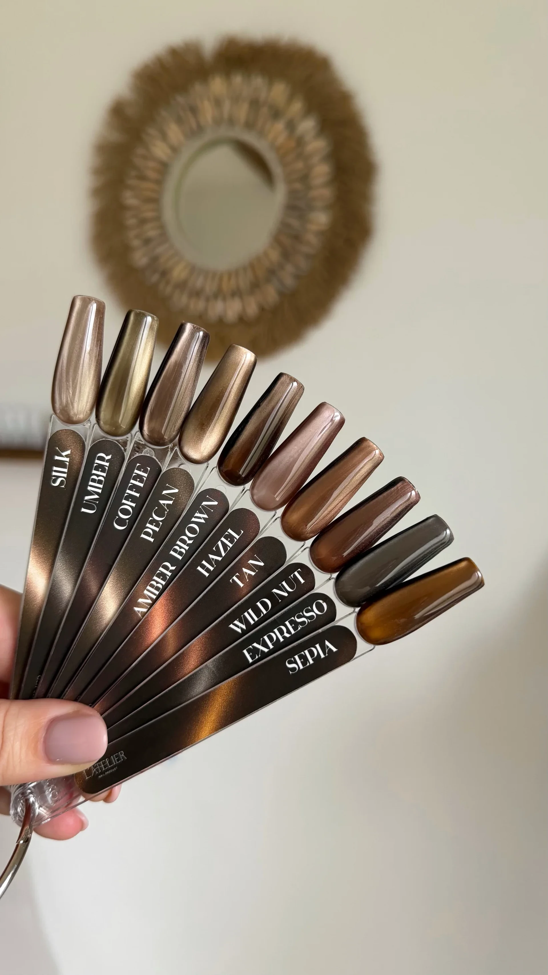 Le vernis semi-permanent Cat Eye 9D Hazel de L'atelier Nail Product est une teinte brun noisette velouté aux reflets magnétiques 9D d'une profondeur envoûtante.