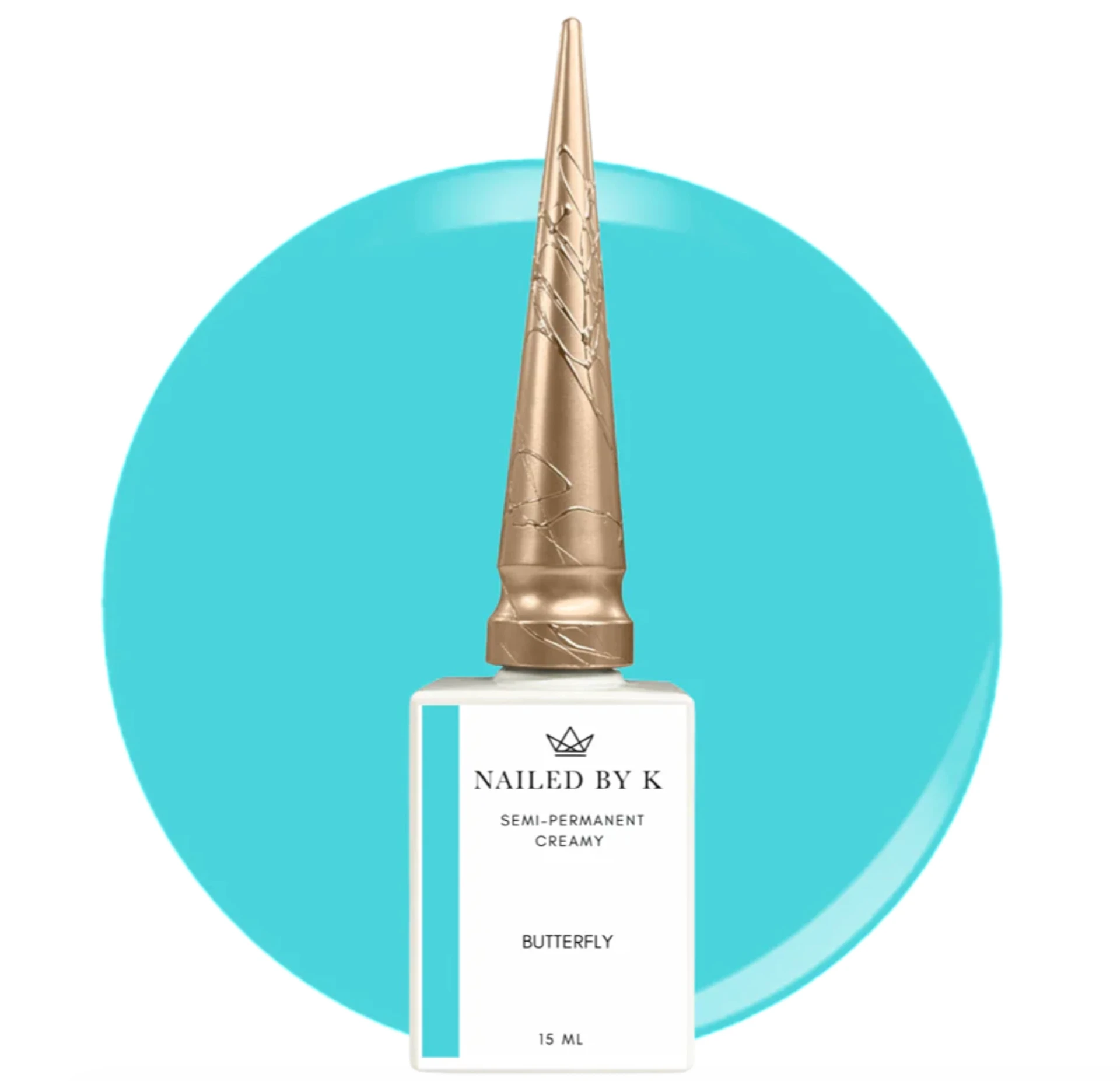 Butterfly de Nailed By K est un vernis semi‑permanent turquoise intense à la texture crémeuse et hautement pigmentée.