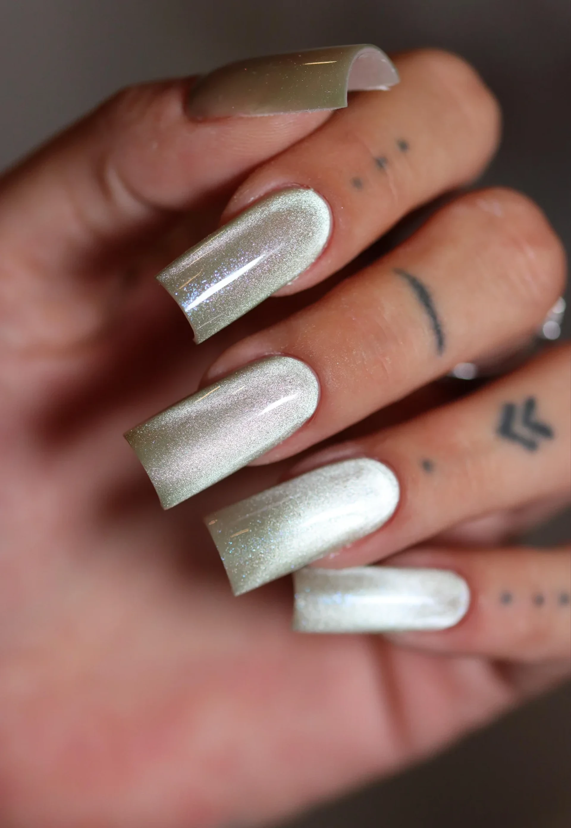 Lion de Nailed By K est un vernis semi-permanent Cat Eye 9D vert kaki doré aux reflets nacrés irisés argentés. Son effet cat eye unique dévoile une bande lumineuse nacrée spectaculaire grâce à un aimant passé avant catalyse, pour un rendu majestueux qui se suffit à lui seul.