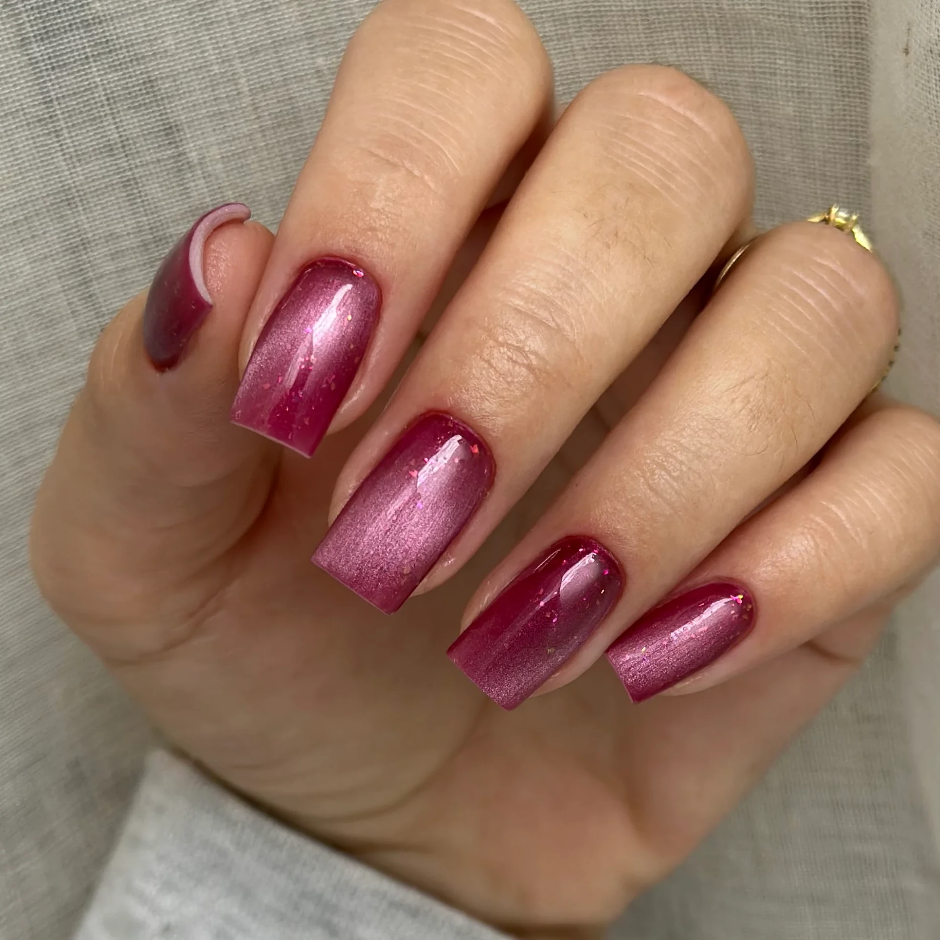 Euphoria de la collection Naked. de Nailed By K est un vernis semi-permanent Cat Eye 9D rose framboise foncé aux flakes nacrées irisées multicolores. Son effet cat eye dévoile une bande lumineuse nacrée selon l'angle et la lumière, pour un rendu profond et festif.
