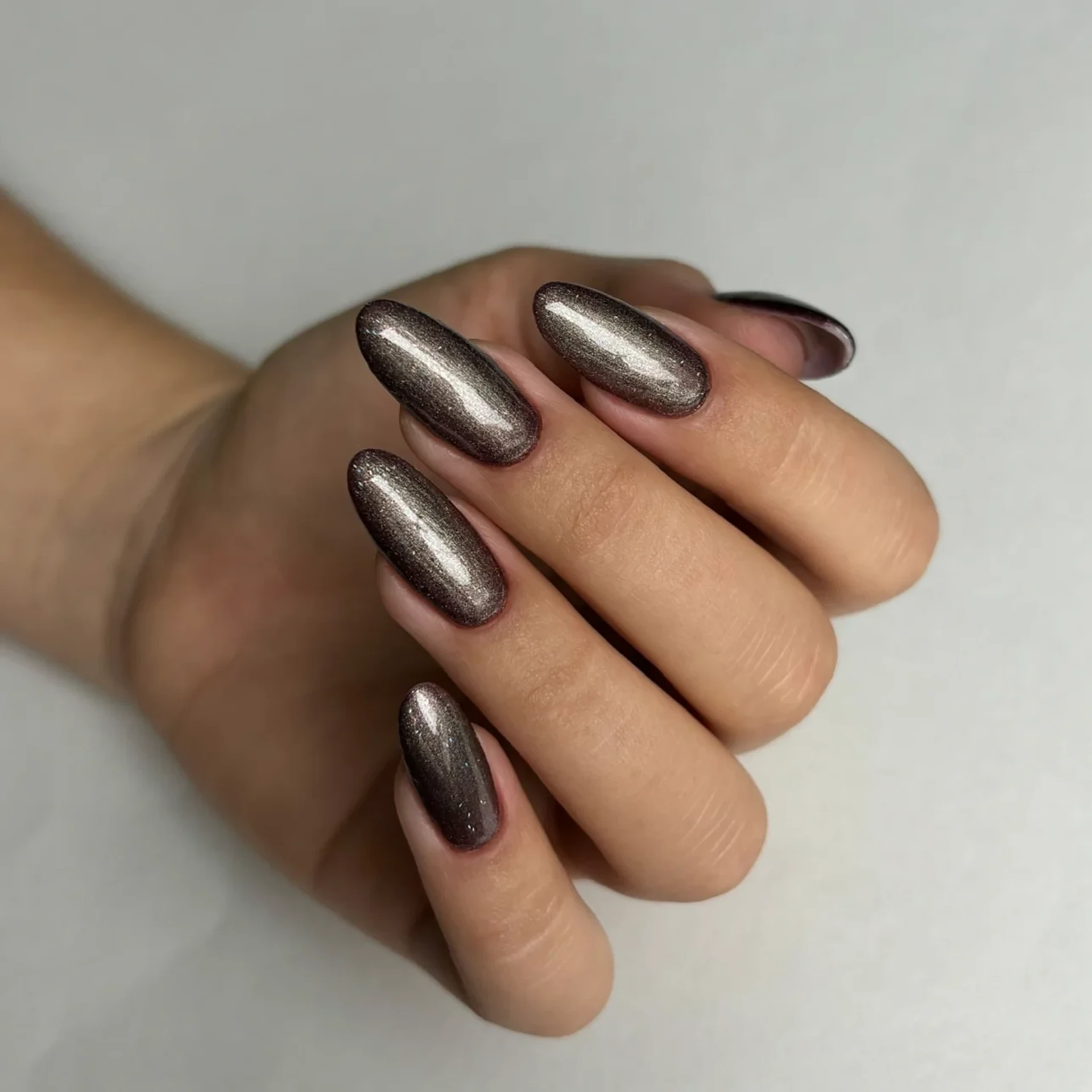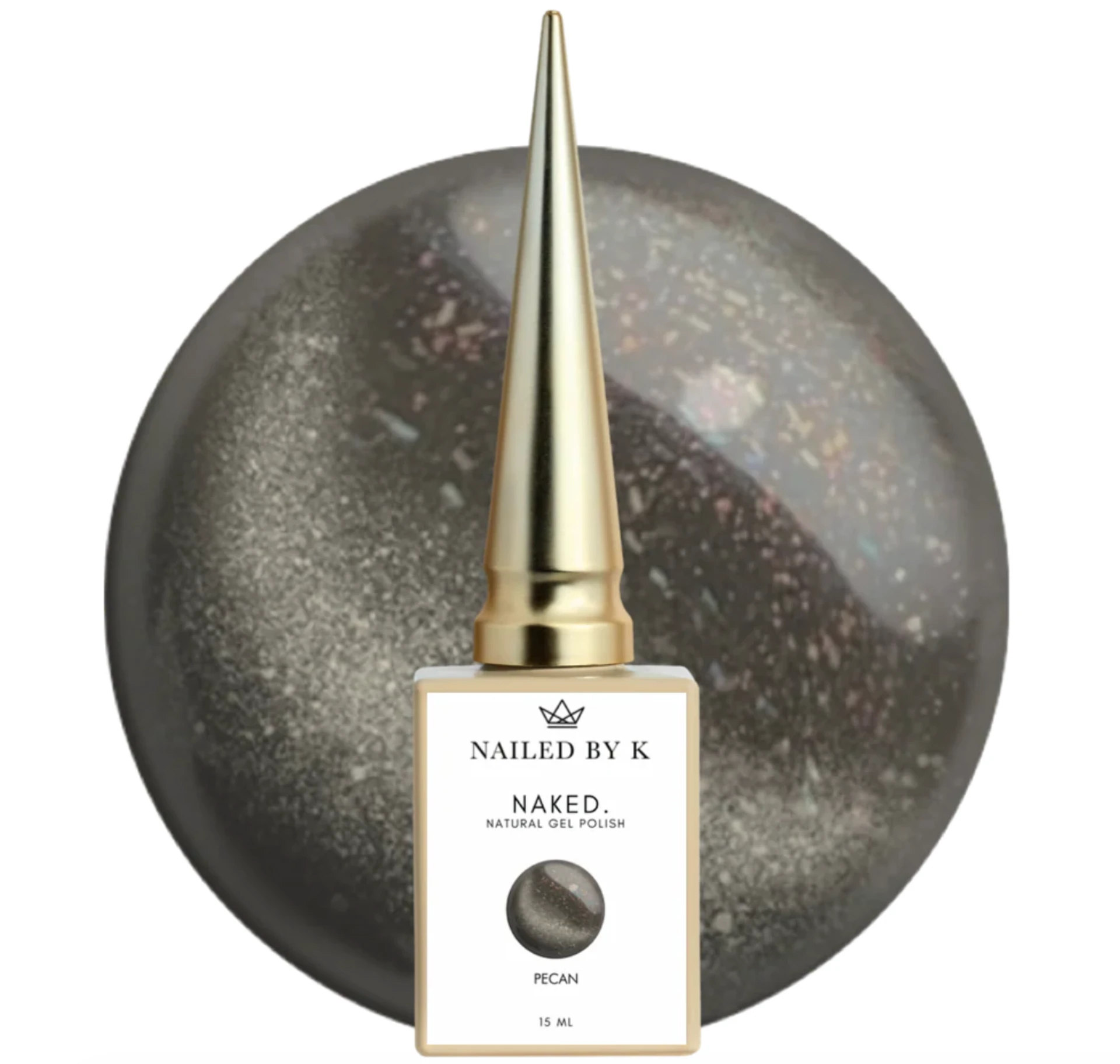 Pecan de la collection Naked. de Nailed By K est un vernis semi-permanent Cat Eye 9D kaki foncé aux reflets nacrés argentés rosés. Son effet cat eye dévoile une bande lumineuse nacrée selon l'angle et la lumière, pour un rendu profond aux tons changeants.