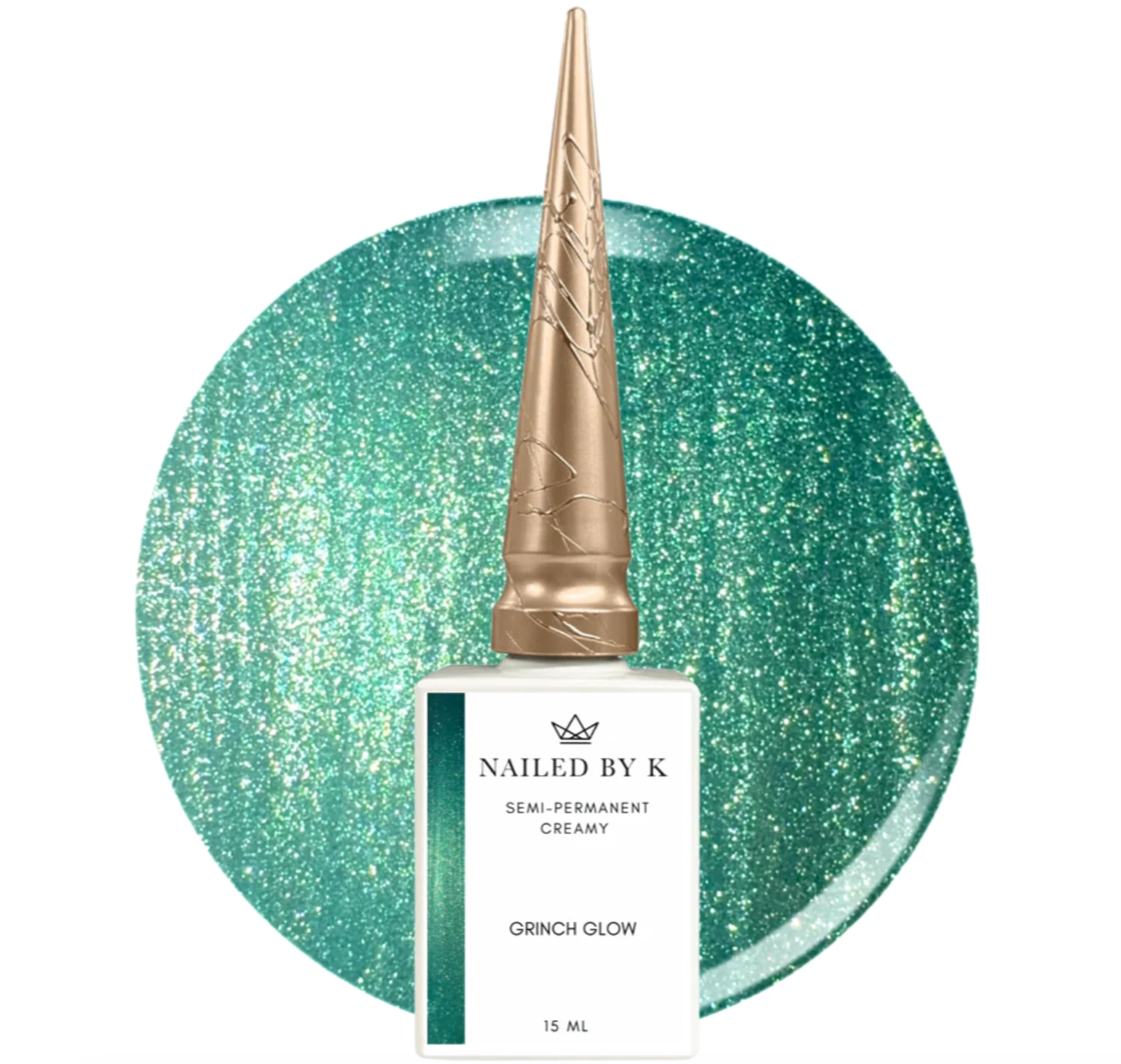 Polar Glow de Nailed By K est un vernis semi-permanent doré champagne chargé de micro-paillettes. Sa texture crémeuse et sa densité de reflets en font une couleur festive et lumineuse, parfaite pour les poses de fêtes comme pour une touche d'éclat au quotidien.