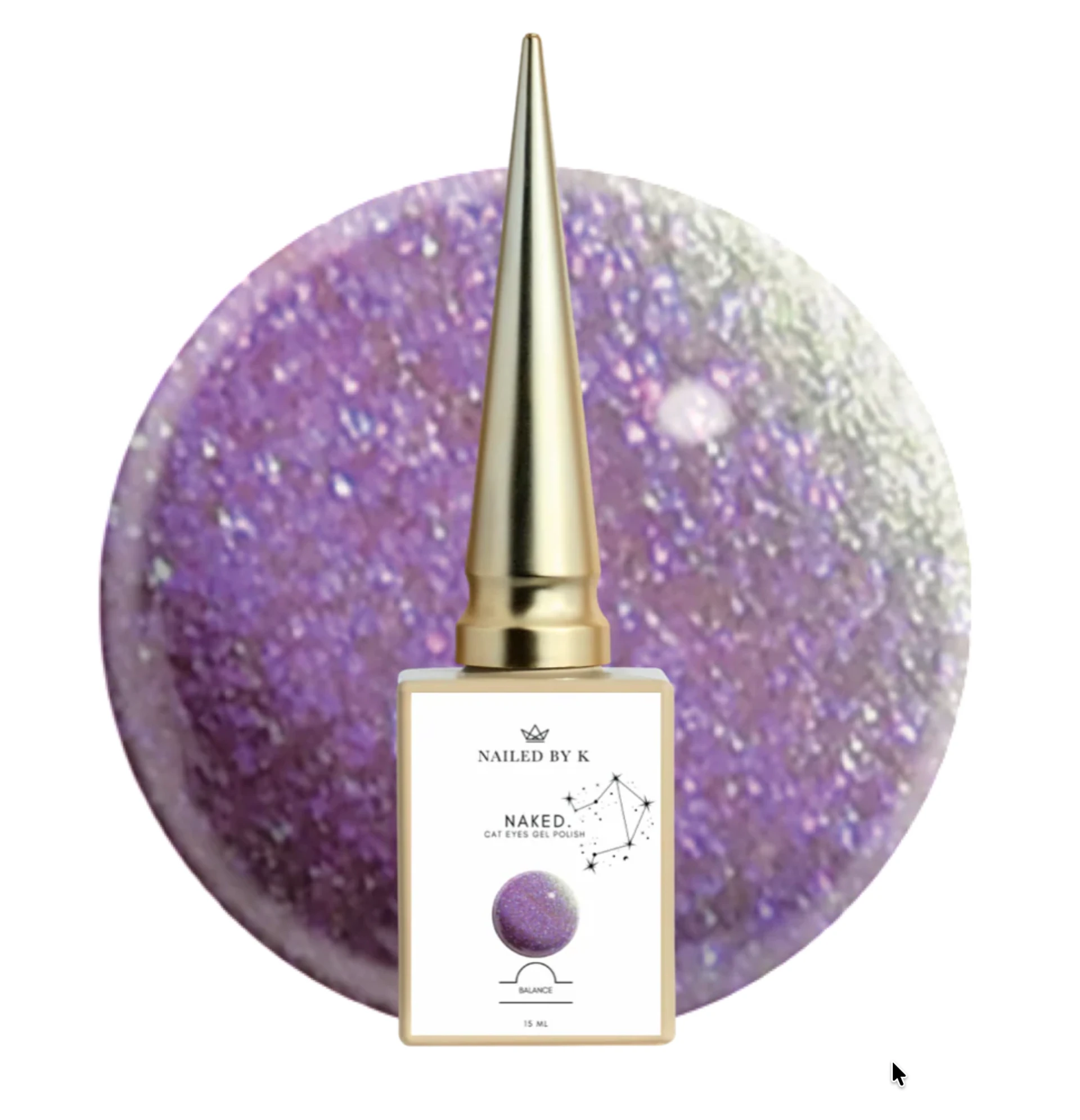 Balance de Nailed By K est un vernis semi-permanent **mauve irisé avec reflets argentés** à la texture crémeuse et scintillante. Sa teinte subtile et lumineuse capte la lumière pour un rendu sophistiqué, élégant et raffiné, parfaite pour des manucures festives ou looks mode.